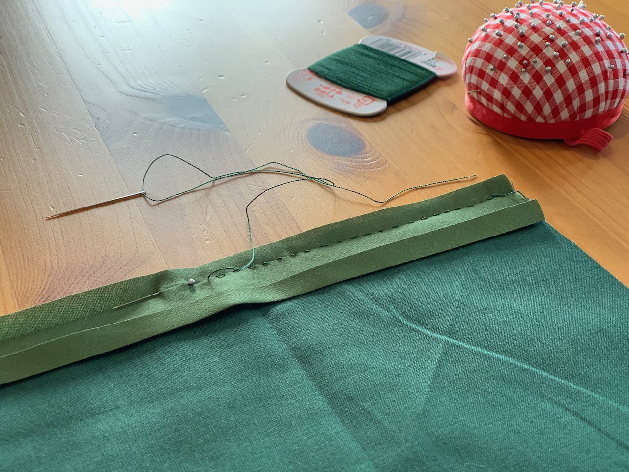 On the wrong side of the fabric I used a felling stitch to sew the bias tape on.