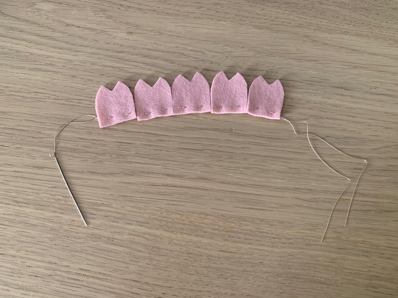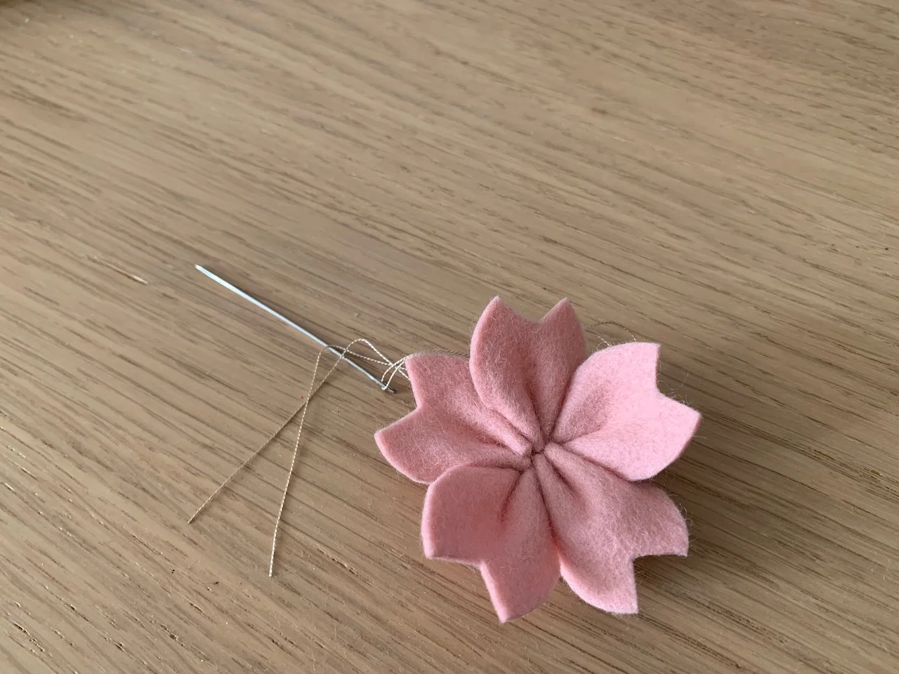 Make a knot and pull tight, gathering the felt petals to create a blossom. Make sure to knot the thread well.