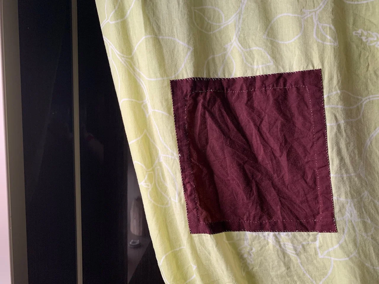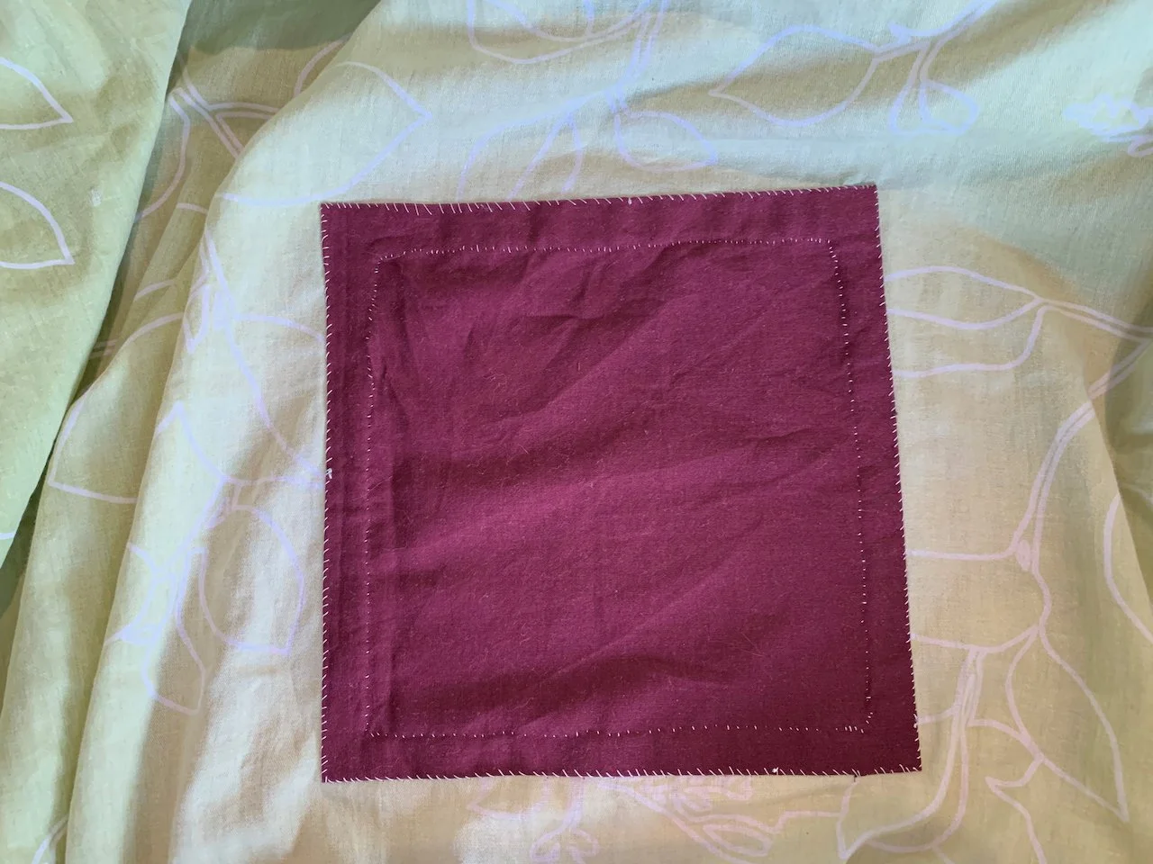 At first I checked the sheet to see how big my patch would have to be. I think I still ended up making it a bit too small. It does cover the whole hole, but on one side I noticed that the fabric is quite worn-out when sewing the patch on. It would be better to make the patch big enough to cover all of the worn-out fabric, I believe.